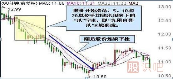 當股價形成頭部時,必然是莊家大量出貨的區(qū)間。因此,在60分鐘K線圖上會連續(xù)出現(xiàn)陰線,有時多達九根陰線,稱為九陰白骨。在日k線圖上出現(xiàn)九根陰線的機會不多,但多陰白骨爪的圖形還是挺多的。由于股價開始滑落60分鐘K線圖上的5、10和20單位平均線會出現(xiàn)向下的“爪”字形,稱為九陰白骨爪。