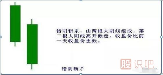 1、錯(cuò)陰斬殺K線組合由兩根大陰線組成,第二根大陰線高開低走。