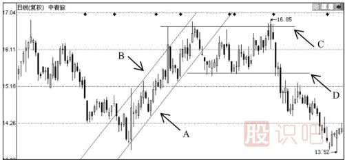 在中級上升趨勢中,出現(xiàn)次級下降趨勢,如若行情跌破次級下降趨勢的支撐線,則說明中級上升趨勢已結(jié)束,股價將依原下降大趨勢繼續(xù)下行。