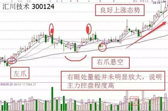 右爪比左爪位置要高。前面的上漲最好是連續(xù)漲停,放出巨量,右爪的量要越小越好,證明洗盤(pán)非常成功。突破蛤蟆頭時(shí)一定要放量。