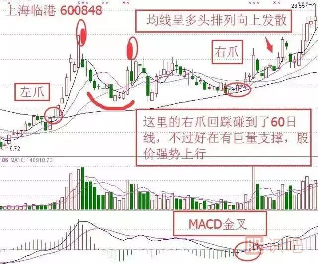 其實(shí)從形態(tài)上來(lái)說(shuō),右眼位置有點(diǎn)變形,但是還是能看出“金蛤蟆”形態(tài)。同樣的,在60日附近該股股價(jià)開(kāi)始啟動(dòng),形成蛤蟆左爪,幾根放量陽(yáng)線(xiàn)到達(dá)一個(gè)小高峰,形成蛤蟆左眼。中途回踩至60日線(xiàn)止跌,后再次小放量上攻,形成蛤蟆右眼。此后量能一直維持縮小,當(dāng)K線(xiàn)再次回踩60日線(xiàn)時(shí)量能縮到極致。右爪形成后,MACD金叉釋放看漲信號(hào),隨后一根巨量長(zhǎng)陽(yáng)打開(kāi)上升通道,均線(xiàn)呈多頭排列向上發(fā)散,股價(jià)不斷攀升。