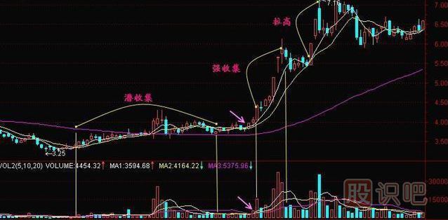 拉 高吸籌也是主力常用的吸籌方法。主力先在股價平穩(wěn)期開始漫長的籌碼收集過程,可被看做是潛收集。到了某個時候,主力覺得時機成熟了,開始大量買進(jìn)籌碼,使股價快速上升,這時的K線圖上出現(xiàn)連續(xù)的陽線,此階段可被看做強收集階段;強收集階段結(jié)束后,主力有時會進(jìn)行震倉洗籌,使很多獲利盤吐出,有時則直接進(jìn)入拉高階段。