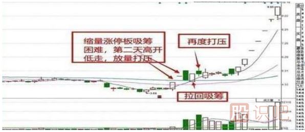 如果在底部區(qū)間,一種可能是漲停板成交量過大,拋壓比較重,那么第二天主動(dòng)選擇高開低走,洗去獲利和不堅(jiān)定籌碼,提高散戶持籌成本;另一種可以判斷主力吸籌不足,漲停板是縮量的漲停,吸籌困難。為控制股價(jià),降低吸籌成本,來進(jìn)行打壓吸籌,第二天即便就是高開低走,成交量出現(xiàn)大幅放大。