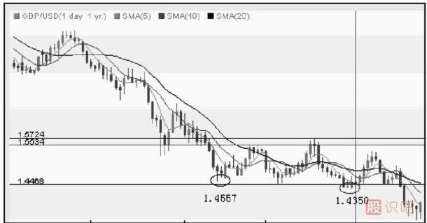 這是我們兩次利用2B法則采取的高賣低買的交易策略,接下來我們?nèi)匀挥欣眠@一法則進行交易的機會。如圖1-2所示,匯價跌至1.435 0低點后,未能進一步下跌,在前低1.446 8振蕩4個交易日后,匯價反轉(zhuǎn)上升,此時即可逢低買入,緊設(shè)止損于1.435 0下方,目標(biāo)即是前期反彈高點1.572 4。