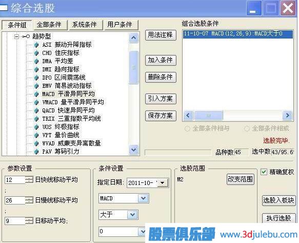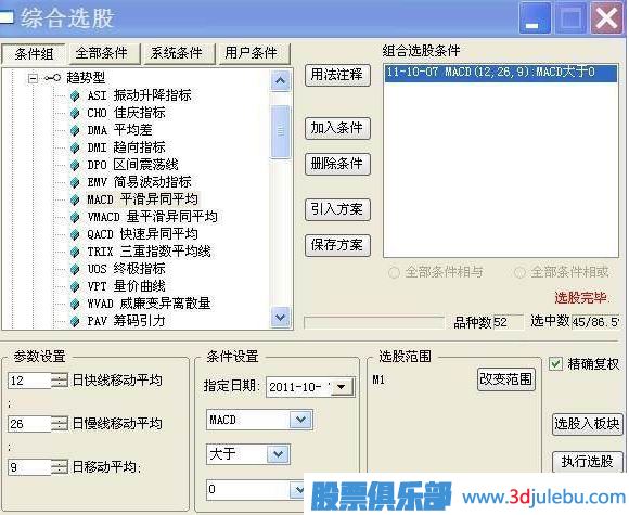 0,點“改變范圍”--“MACD選股”,選擇周期為“日線”,再點加入條 件,最后點選股入板塊,然后新建板塊名稱:“M1”,點確定,將日周期的MACD大于0的股票選入到M1板塊,目標(biāo)縮小到52個股票。
