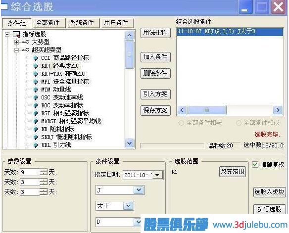 D,點“改變范圍”--“M3”,選擇周期為“日線”,再點加入條件,最后點 選股入板塊,然后新建板塊名稱:“K1”,點確定,將日周期的KDJ的J大于D的股票選入到K1板塊,目標(biāo)縮小到20個股票。