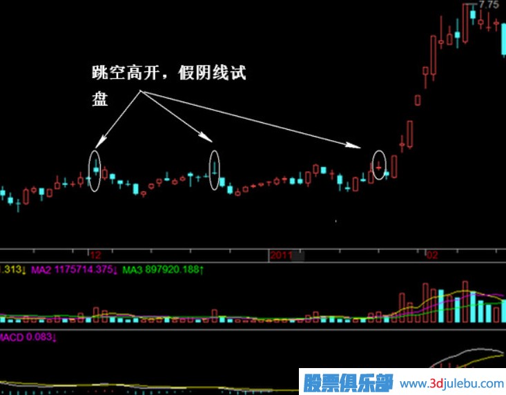 (2)正式拉升前的試盤 在正式拉升前,主力為了了解該股的其他投資者持有籌碼的鎖定程度,在盤中風平浪靜時出其不意地猛然將該股的股價大幅度地拉升或者是在開盤時就大幅高開,然后讓其自然回落,以測試盤中籌碼的拋壓情況。如果拉升時遭遇大量的拋壓盤,說明此時拉升股價的時機還不成熟,還需要洗盤。如果拉升時遇到的拋壓盤稀少,說明洗盤已經(jīng)到位,籌碼已經(jīng)充分鎖定,這時可以考慮立刻拉升或者擇機拉升。 這種建倉完畢后,正式拉升前的試盤表現(xiàn)在K線上就是一根帶長長上影線的K線或者是跳空高開的假陰線,這種假陰線,我們稱之為“倒拔楊柳”。 此次試盤,目的是測試正式拉升時的拋壓盤的輕重,然后根據(jù)測試了解到的拋壓情況來決定隨后的洗盤方式和拉升的時機。