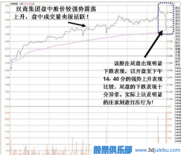 2、盤中先快速拉高股價(jià),然后慢慢往下打壓實(shí)施威逼式洗盤!