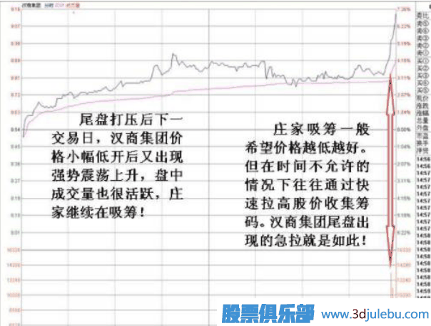 莊家打壓吸籌行為動(dòng)作中,有一種是利用 尾盤最后幾分鐘快速將 股價(jià)打低 。一般用幾筆大賣單將股價(jià)打低 2%—3% 左右。建倉時(shí)莊家 尾盤 打低 股價(jià) 目的是, 為了在次日吸籌有更便宜的價(jià)格,以降低籌碼平均成本。 股價(jià)被砸低后使得當(dāng)日該股日 K 線影有較長上影線十字星,制造難看的圖表。這起到振倉和減少技術(shù)派大量跟進(jìn)作用。