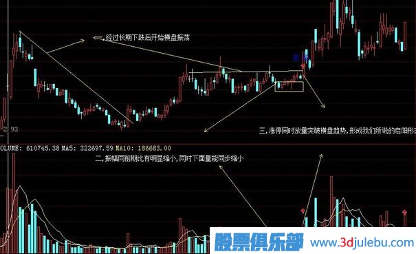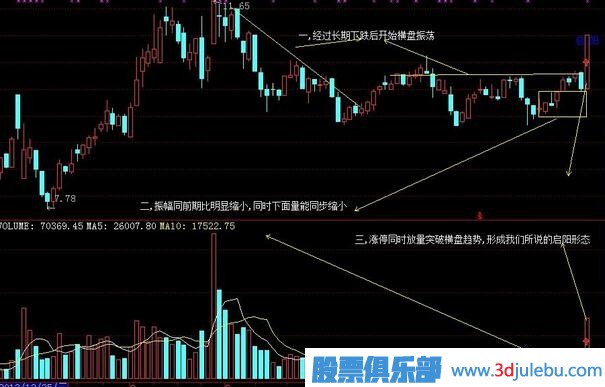 三,漲停同時(shí)放量突破橫盤(pán)趨勢(shì),形成我們所說(shuō)的啟陽(yáng)形態(tài)