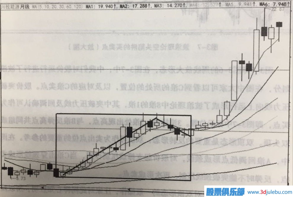 圖3-6是川技221年1月至1月的月線走勢(shì)。月線級(jí)別的K線走勢(shì)清晰明了,大家都能清楚地看到股價(jià)所在的位置,在圖中我們也把月線級(jí)別的1浪和2浪做了標(biāo)示。為了使大家更清楚地看到莊家利用波浪理論布置的空頭陷阱,我們對(duì)1浪和2浪做了放大處理。