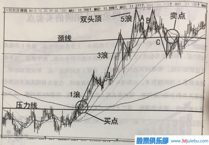 圖3- 7即圖3 -6的周線放大形態(tài),在圖3-7中,中我們對(duì)股價(jià)運(yùn)行進(jìn)行了波浪劃分,在圖中大家可以看到C浪的所處的位置,以及對(duì)應(yīng)的C浪賣(mài)點(diǎn)。股價(jià)突破壓力線向上運(yùn)行形成了波浪理論中8浪的1浪,其中突破壓力線及回調(diào)確認(rèn)可作為買(mǎi)點(diǎn),即圖3-7中標(biāo)示位置。3浪拉升,5浪處出現(xiàn)高點(diǎn),與B浪反彈高點(diǎn)共同組成雙頭頂。雙頂形態(tài)是重要的反轉(zhuǎn)形態(tài),雙頂可作為賣(mài)出點(diǎn)位的重要的參考。在圖中,A浪回調(diào)低點(diǎn)形成頸線,對(duì)股價(jià)起支撐或壓制作用,當(dāng)C浪擊穿頸線形成賣(mài)點(diǎn),反彈時(shí)不能突破頸線壓制,再次形成賣(mài)點(diǎn)。