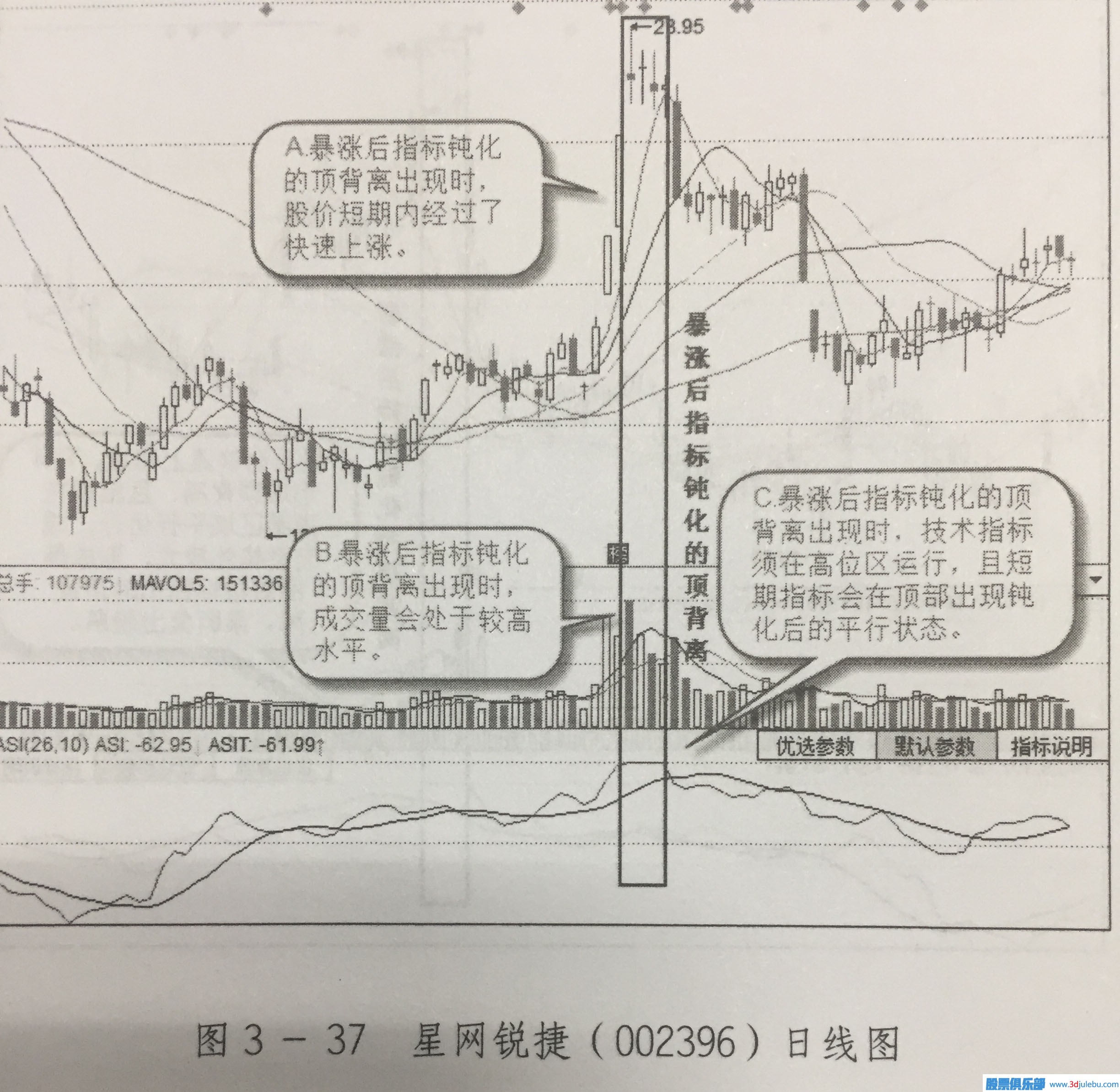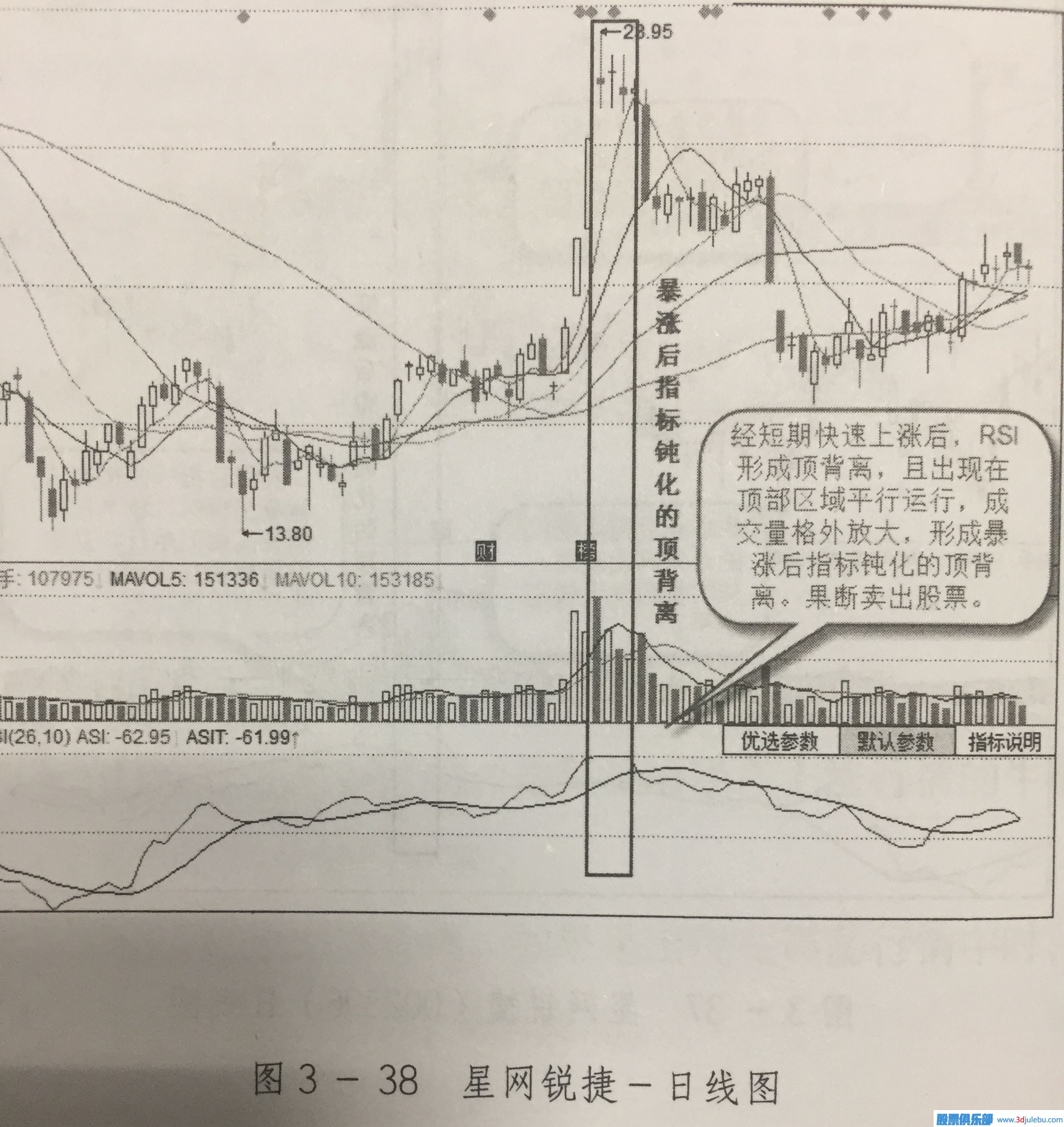 陽線跳空式上漲后,星網(wǎng)銳捷技術(shù)指標(biāo)中的ASI到達了頂部區(qū)域,并出現(xiàn)頂部的極限平行運行,但股價依然在上漲,出現(xiàn)了頂背離,從而形成暴漲后指標(biāo)鈍化的頂背離。成交量也在主一暴漲行情中出現(xiàn)了暴增,這說明主力是在通過短線快速拉升股價出貨。因此,趨勢即將出現(xiàn)反轉(zhuǎn),投資者應(yīng)果斷賣出手中股票,如圖3-38所示。