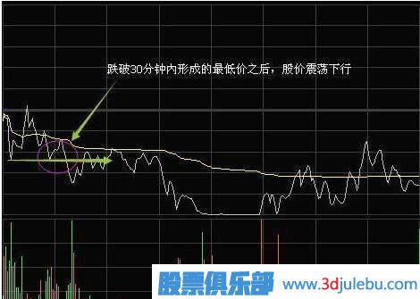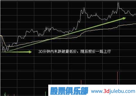 每日開盤后主力對(duì)股價(jià)打壓或造成急跌的現(xiàn)象通常會(huì)在10分鐘內(nèi)完成,最多不超過(guò)30分鐘,所以開盤打壓股價(jià)絕非散戶行為。30分鐘內(nèi)在分時(shí)圖上形成的最近價(jià)非常具有參考價(jià)值,多數(shù)情況下主力要堅(jiān)守此價(jià)格,一旦跌破此價(jià)格就需要引起警惕,在主力都不護(hù)盤(不保護(hù)最低價(jià))的情況下,股價(jià)難有表現(xiàn)。任何股票在開盤30分鐘內(nèi),只要不跌破最低價(jià),都無(wú)需恐慌和害怕。一旦出現(xiàn)破位跡象,以短線操作為主的投資者就應(yīng)立刻出局觀望。如圖: