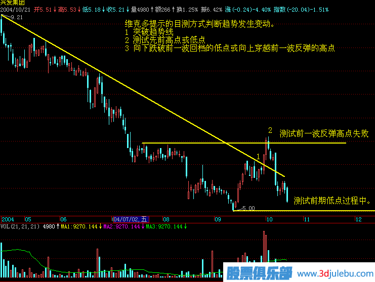 3、在下降趨勢中,價格向上穿越先前的短期反彈高點;或在上升趨勢中,價格向下穿越先前的短期回檔低點。