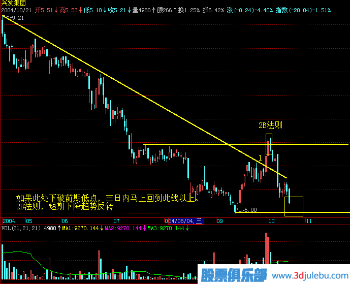 2B法則:上升趨勢中,如果價格已經穿越先前的高價而未能持續(xù)挺升,稍后又跌破先前的高點,則趨勢很可能會發(fā)生反轉。下降趨勢也是如此。