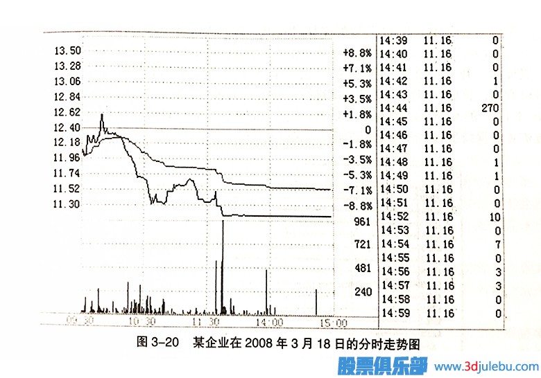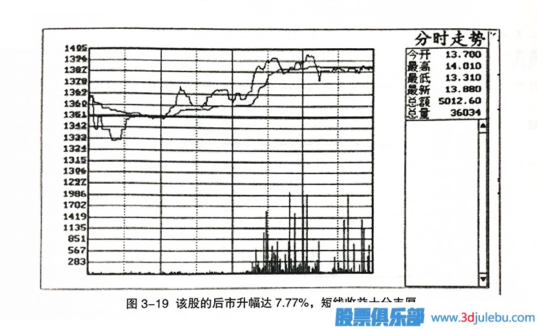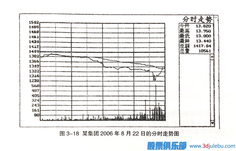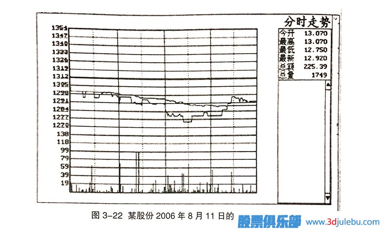圖3-18是某集團(tuán)2006年8月22日的分時(shí)走勢(shì)圖。從圖中可以看出,8月22日開盤后,這只股票就開始下跌,股價(jià)由開盤時(shí)的13.82元,下跌到14:38的13.00元,跌去0.82元。14:40,一筆228手的成交阻止了股價(jià)下跌,14:42,這只股票又放出了591手的大成交量將股價(jià)提升到13.14元,隨后繼續(xù)放量,直到收盤,股價(jià)最終被鎖定在13.49元的價(jià)位(見下表),這一現(xiàn)象表明這只股票尾市有主力掃盤,后市有望漲升。事實(shí)也證明了這一點(diǎn),第二天,該股就止跌反彈;第三天,該股發(fā)力上揚(yáng),股價(jià)最高達(dá)到14.01元,當(dāng)日收盤價(jià)為13.88元。按最高價(jià)計(jì)十算,該股的后市升幅達(dá)7.77%;按收盤價(jià)計(jì)十算,升幅也達(dá)6.77%,短線收益十分豐富。