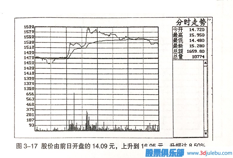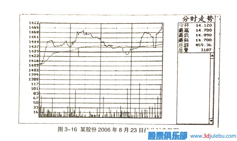圖3-16是某股份2006年8月23日的分時(shí)走勢(shì)圖。在此之前,該股已從2006年4月日26.97元的高位下跌到2006年8月22日的14.09元,股價(jià)下跌了47.76%。2006年月23日,這只股票開盤后仍慣性下跌,最低點(diǎn)跌到14.09元,因它下跌的幅度過(guò)大,下午開盤后,盤中出現(xiàn)了三次放量走勢(shì),第一次放量出現(xiàn)在13:54,每分鐘成交量為105手;第二次出現(xiàn)在14:17,每分鐘成交量為123手;第三次出現(xiàn)在14:57,每分鐘成交量為115手。這三次的每分鐘成交量,都比其他時(shí)間每分鐘的成交量多10倍以上。在成交量出現(xiàn)放量時(shí),該股股價(jià)也在小幅上升,特別是收盤前3分鐘的一筆成交量出現(xiàn)時(shí),股價(jià)猛升到14.65元,這預(yù)示著后市這只股票的股價(jià)將會(huì)上漲。第二天,該股果然一路走紅,股價(jià)由前日開盤的14.09元,上升到1695元,升幅達(dá)8.50%(見圖3-17)。這也證明股價(jià)經(jīng)過(guò)大跌后,如果第三篇每日實(shí)戰(zhàn)看盤要點(diǎn)—開盤與收盤某一天尾市出現(xiàn)了成交量放