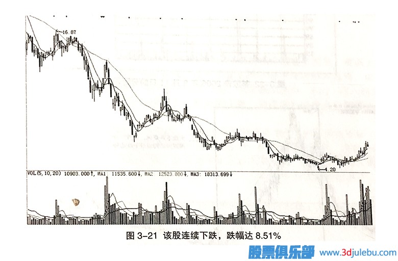 圖3-20是某企業(yè)在2008年3月18日的分時(shí)走勢(shì)圖。從圖中可看到,該股從當(dāng)日10:30起成交量開始萎縮,到收盤時(shí)平均的成交量只有不到20手,比再次之前的平均每分鐘手?jǐn)?shù)大幅萎縮,股價(jià)也一度跌停,顯示出價(jià)跌縮量的走勢(shì)形態(tài)。從圖3-21中可以看出,在以后的幾個(gè)交易日中,該股繼續(xù)下跌,從1687元一度下跌到420元,跌幅達(dá)到75%,這就證明了“尾市縮量,股價(jià)下跌”的走勢(shì)是下跌信號(hào),應(yīng)該引起重視,千萬(wàn)不要在這個(gè)時(shí)候買進(jìn)股票。