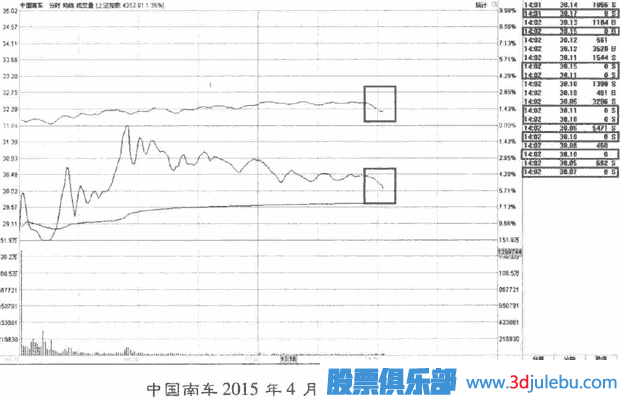 撤單是常見的盤口現(xiàn)象,每只股票幾乎每天都會發(fā)生,有的是散戶自發(fā)的撤單,是正常交易;有的是主力刻意撤單,是虛假申報。下圖為中國南車的個股分時圖,2015年4月22日14:02時,因大盤趨勢向下調(diào)整,中國南車大量賣單撤銷。