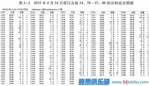 當(dāng)然,在大勢向好時,大賣單往往也會出現(xiàn)在委托盤口,為的就是吸引大買家吃進(jìn),此時大賣家不顯身,大買家通常也無法顯身;而在下跌趨勢中,看好該股的大買單也往往會出現(xiàn)在委托盤口,為的就是等待大賣家顯身。表2-2為2015年4月24日浙江眾成14:39-15:00的分時成交明細(xì),明細(xì)表顯示并無大單。