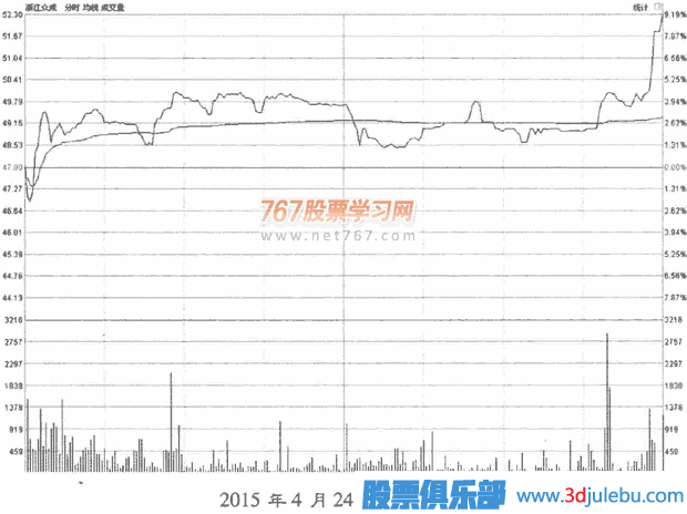 但是2015年4月24日浙江眾成的個股分時圖卻顯示,尾盤在急劇拉升(下圖),短短的9分鐘,由49.81元拉升至52.30元,幅度高達(dá)近5%,顯然是莊家通過隱性買賣盤在進(jìn)行拉升。莊家將大單化整為零,隱藏在無數(shù)個小單中。