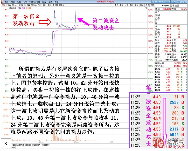 市場(chǎng)上相當(dāng)因多突發(fā)消息被暴炒的概念股,就是以游資接力作為主要力量炒起去的。不清楚的人總以為那是一個(gè)莊家自己在瘋狂拉升惡炒。游資接力行為中大部分屬于市場(chǎng)中自然正常買賣交易,多數(shù)沒有什么特別特征。部分游資接力入市動(dòng)作特別明顯的,他們的行為動(dòng)作就可明顯的看到。筆者選了幾個(gè)游資接力入市盤口表現(xiàn)較突出的個(gè)股為例,通過盤口動(dòng)作剖析一下這方面現(xiàn)象。