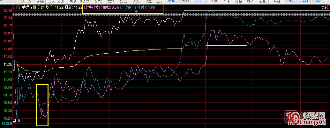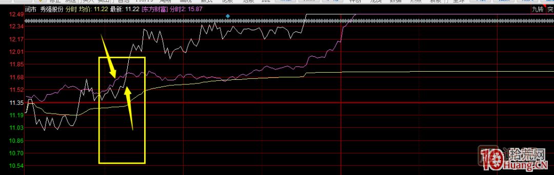 在這個(gè)分時(shí)圖中很清楚,東方財(cái)富先動(dòng),秀強(qiáng)的資金立刻跟上!