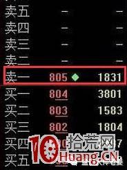 盤口特征: 買盤買一以下全是大買單,但賣盤卻只有賣一有較大賣單,其余賣檔掛單較為正常,并且賣一大賣單吃掉后又反復(fù)出現(xiàn)。