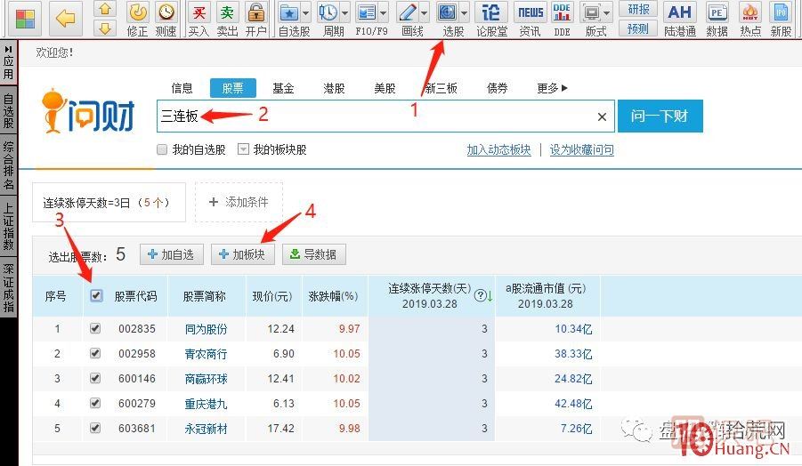 同花順軟件里面自帶一個(gè)“問財(cái)”功能,去界面以后,輸入當(dāng)天的連板,然后加到對應(yīng)自定義板塊就行(加之前,記得把前一天的個(gè)股刪掉)
