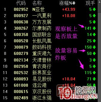 左二,市場漲跌幅排名,后面跟了一個(gè)<現(xiàn)手>功能(成交量)。注意了,這個(gè)功能很有用,漲幅排名和現(xiàn)手功能組合,盤中盯著現(xiàn)手,成交量突然放大就是板上放量了,能提前知道有沒有炸板跡象。