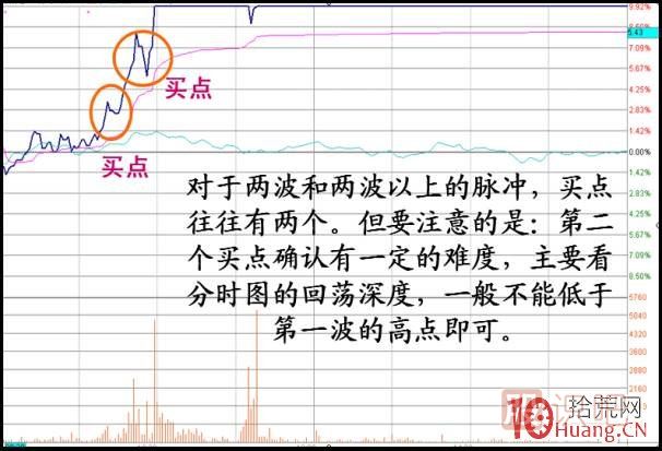 不過事物都是兩面性的,雖然該股多出了一個買點,但是其“確認”漲停的難度也加大了。這里有一個最低標準,就是第二波的脈沖回蕩的低點不能低于第一波脈沖的高點 ,第三波脈沖不能低于第二波脈沖的高點,否則這種脈沖就是無效的,后面很可能演化成沖高回落的走勢,請切記!