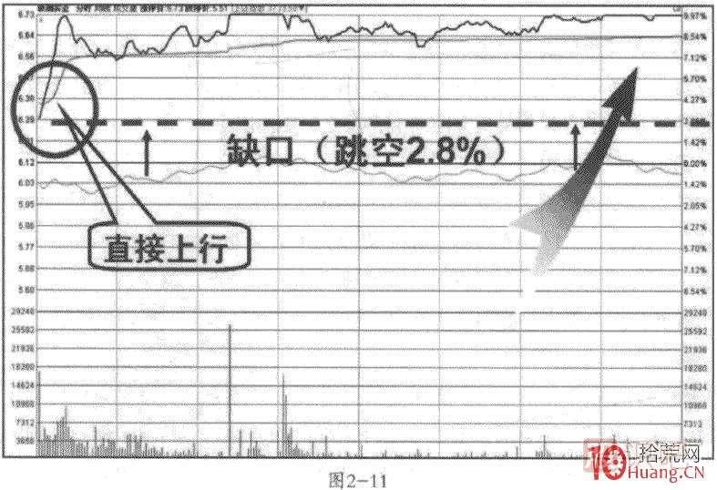 如果跳空開盤后沒有任何回補(bǔ)動(dòng)作,那么全天的股價(jià)走勢(shì)必然會(huì)沿著跳空的方向強(qiáng)力運(yùn)行,請(qǐng)看圖2-11和圖2-12。