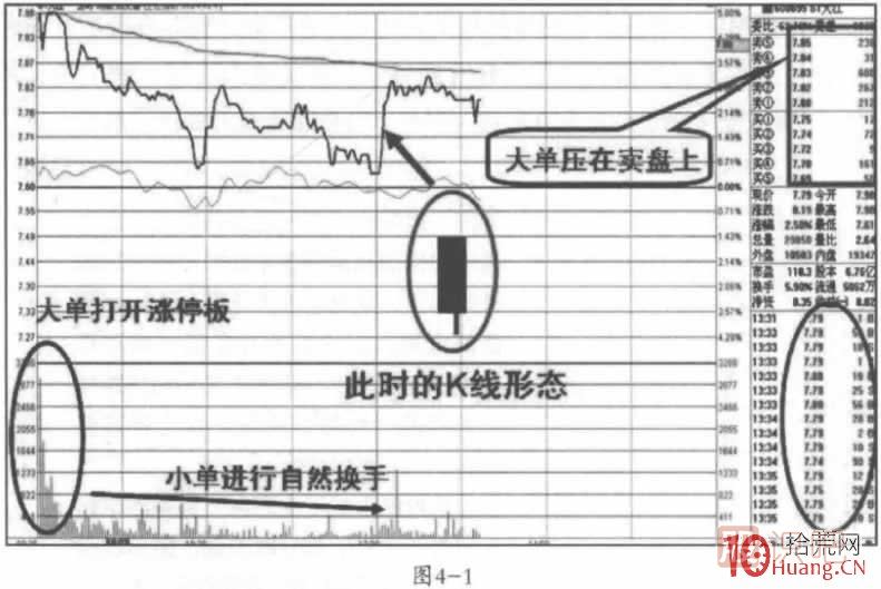 圖4-1中的盤口語言給我們展示的是一種高位U形洗盤的前半段:該股早盤以漲停板開盤,之后迅速打開漲停,又快速封上漲停,5分鐘又一次打開漲停,但這次沒有馬上去封漲停,而是開始了洗盤路程——我們看到,該股上午出現(xiàn)了兩個(gè)低點(diǎn),但是兩個(gè)低點(diǎn)的成交量都比開盤時(shí)小得多,是一種小單成交的結(jié)果。而在掛單欄中,大單卻壓在賣盤上,給散戶一種泰山壓頂?shù)母杏X,散戶紛紛出逃就造成了小單的頻繁成交(見成交欄的橢圓中所示)。