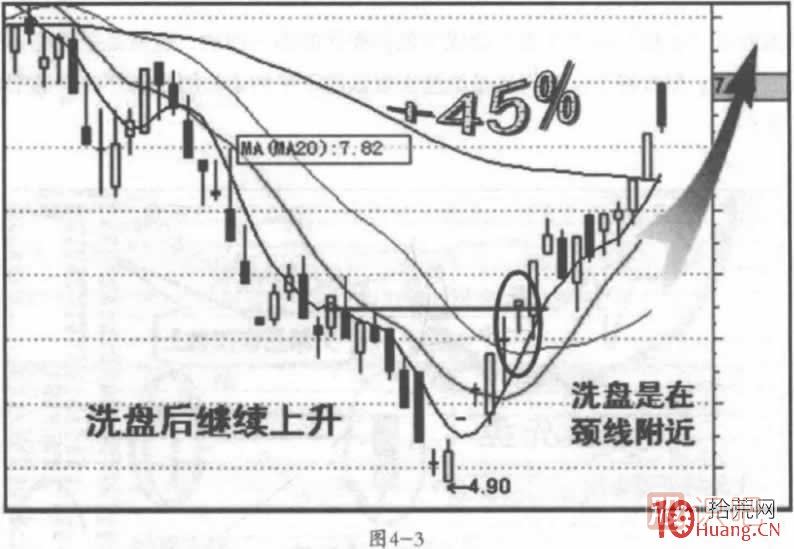 一是洗盤多在K線形態(tài)的頸線處,因?yàn)轭i線是一個(gè)可上可下的地方,