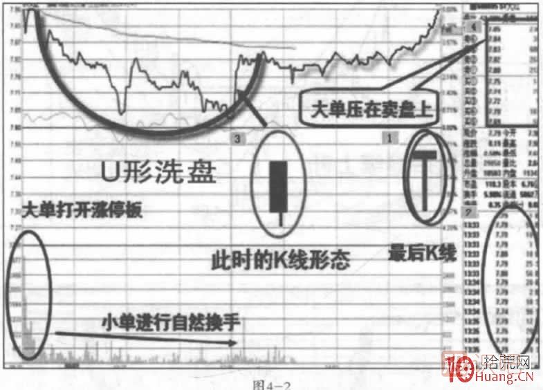 U形洗盤是指股價(jià)全天走出一種高開一低走一再高收的分時(shí)走勢。盤口特征多為大單打穿關(guān)鍵價(jià)位,小單進(jìn)行非密集成交。同時(shí),大單呈現(xiàn)出掛而不交的盤口景象,其目的是制造分時(shí)K線的陰線效果來恐嚇市場,見圖4-1.