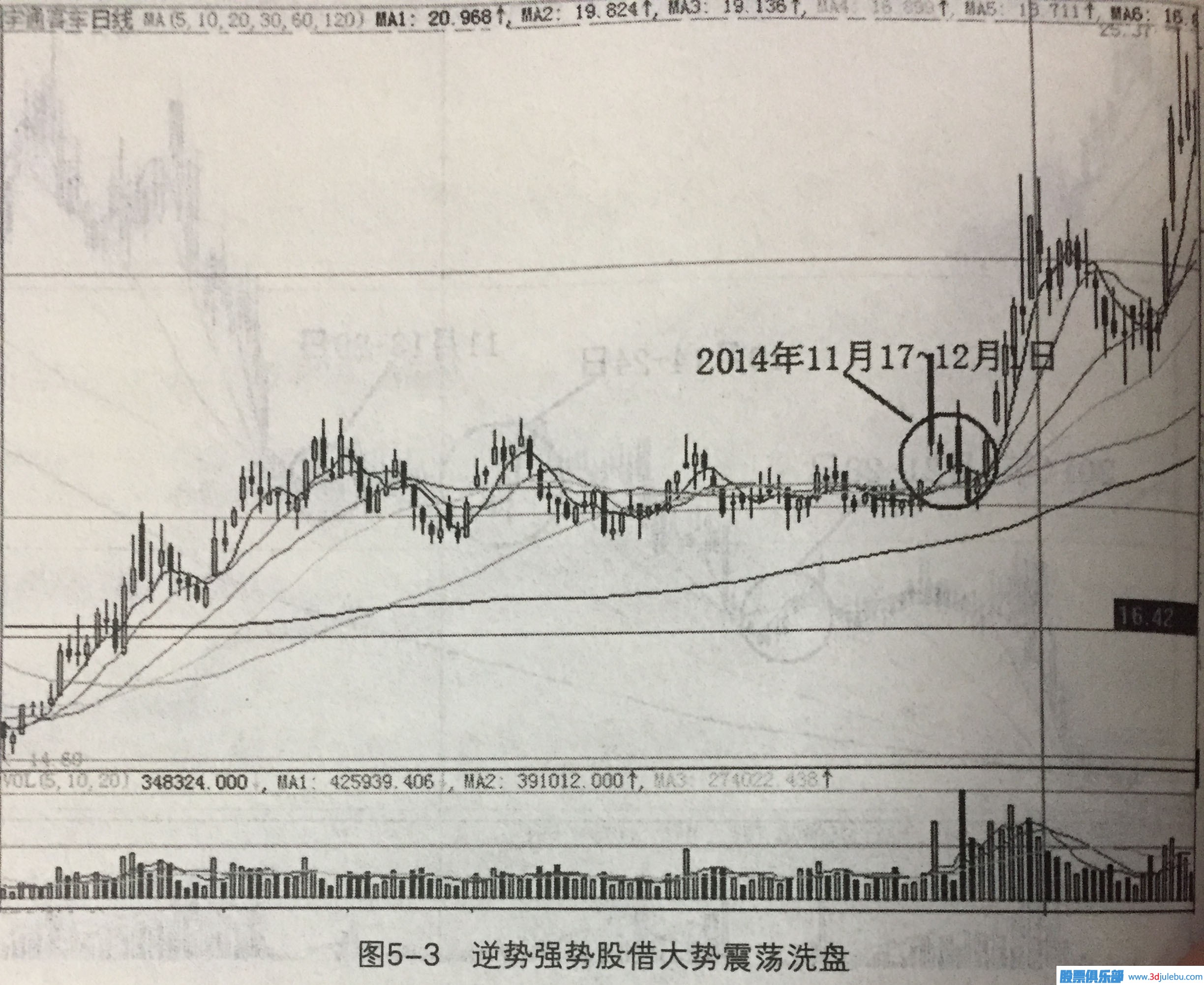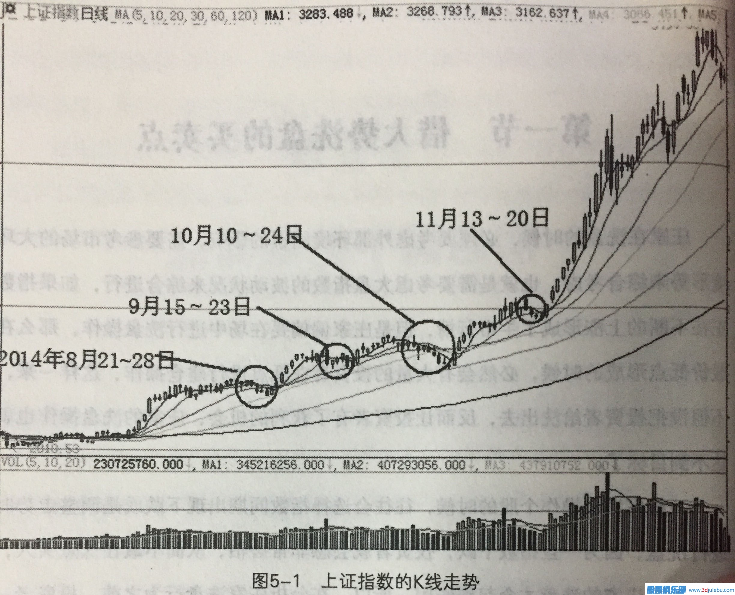 圖5-1是上證指數(shù)2014年8月以來(lái)的K線走勢(shì),在大盤突破2000點(diǎn)這個(gè)平臺(tái)后,大盤出現(xiàn)連續(xù)調(diào)整,先后跌破20日線、30日線,5日線與10日線形成死叉,圖形形態(tài)非常難看,技術(shù)形態(tài)上似乎已經(jīng)形成了向下的破位。但我們仔細(xì)分析可以看出,在指數(shù)調(diào)整時(shí)候,成交量出現(xiàn)了萎縮的跡象,這種量能變化說明資金并沒有在盤中進(jìn)行出貨操作,如果是資金在出貨成交量怎么可能不放大呢?所以,從量能上來(lái)看指數(shù)并未見頂,指數(shù)未見頂也就意味著盤中的絕大多數(shù)個(gè)股也沒有形成頂部。所以在這個(gè)時(shí)間段內(nèi),只要個(gè)股出現(xiàn)了下跌的走勢(shì), 那就意味著莊家正進(jìn)行洗盤操作的可能性較大。從隨后的上證指數(shù)走勢(shì)中, 我們就可以驗(yàn)證到了這一點(diǎn),隨后的幾個(gè)月指數(shù)一路上揚(yáng),漲勢(shì)喜人。