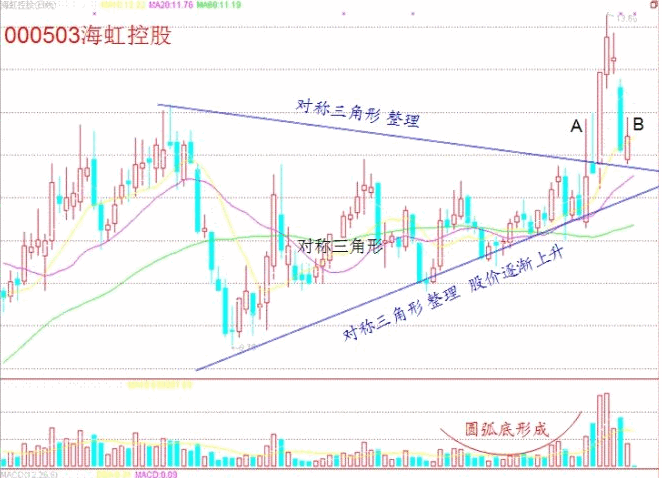 這訣是說股票的長時間盤整形態(tài)和未來變盤方向的。當(dāng)一只股票中線或者長線盤整時,其K線圖多會走出一個較大 的三角形,再接一個較小的三角形,有的長線股可能走出大、中、小三個甚至是多個逐漸趨小的三角形,當(dāng)擠到最頂尖時,就會變盤。如果先向上突破不成,就成了 假突破,必會引發(fā)一輪大砸盤;而如果尖端再次向下破位,一般會用多根連續(xù)的陰線向下挖出一個坑,而后則會一路上揚。操作中,要注意假突破的判斷,以防追高 被套,而連續(xù)陰線挖坑則是長線介入的最佳時機(jī),其后的漲幅一般會突破長期整理的平臺,不可賣出過早。