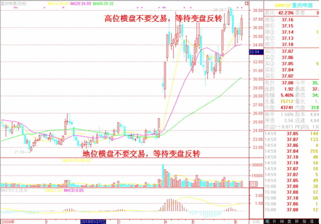 這一口訣的內(nèi)容包括了訣一中“橫盤不交易”的內(nèi)容,但主要的意思是說,當(dāng)一只股票或者權(quán)證持續(xù)上漲或者下跌 了一段時間后就進(jìn)入了橫盤狀態(tài),此時不必在高位全倉賣出,也不必在低位全倉買進(jìn),因為盤整之后就會變盤,故盤整時期不可主觀決定建倉或清倉。如果是高位向 下變,則及時清倉,不會有損失;如果是低位向高變,及時追進(jìn),也不會踏空。