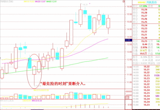 這 一訣是繼十四訣的進(jìn)一步說明。如果這根特大的陽線出現(xiàn)了長長的上影,尾盤有獲利盤涌出,(有時也是大盤的尾市突然變盤影響)上影超過了K線實體,或者至少 也有當(dāng)日升幅的三四個點以上,那么在分時線尾盤跳水收盤的一瞬間我則快速重倉搶入。次日開盤后,會直沖前日高點,或者再創(chuàng)新高。