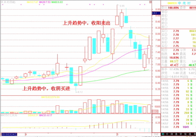 這一口訣與第一訣有點類似,就是講逆市而動的道理,第一訣是說短線的,第二訣是說中線的。即,買時,選則K線收陰線時買;賣時,選則K線收陽線時賣。