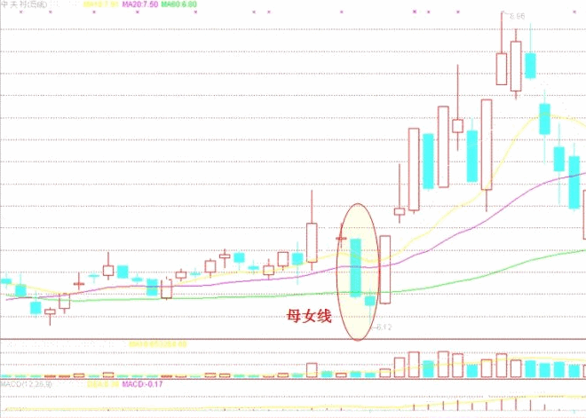 所謂“母女”線,是指權(quán)證,多為認(rèn)沽權(quán)證走出的一種特別的標(biāo)志性形態(tài)。當(dāng)沽權(quán)上漲數(shù)日到高點時,因無正股走勢支撐,不同于購權(quán),會突然大跌,跌出一根大陰 線和一根小陰線,大陰線實體長,跌幅在八九個點,以至于十幾個點之上,小陰線實體小,通常有很短的上下影,因是大小兩陰,故狀如“母”攜“女”。此種形態(tài) 也常出現(xiàn)在下跌通道中。其后走勢會以兩三個小陽線的形態(tài)向上反彈,反彈到大陰線的一半左右,或者到10日均線(弱勢的到5日均線)后,再次向下調(diào)整。操作 上宜在“女”線的腳部買入,待反彈到10日(或5日)均線壓力位處賣出??偟恼f來,這種形態(tài)操作的利潤空間不大,但比較安全。