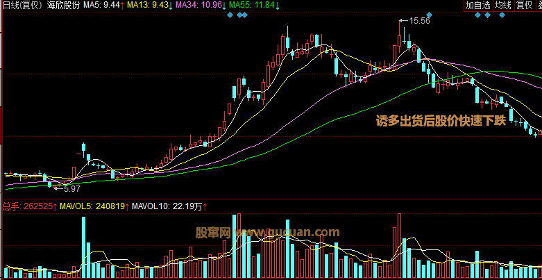 如果你在放巨量的第一天跟進(jìn),那第二天出場(chǎng)還存在著一定的盈利機(jī)會(huì),這就是前面提到過(guò)的超短線機(jī)會(huì),但這似乎是在刀口舔血,因?yàn)榇藭r(shí)主力手中的籌碼已經(jīng)所剩無(wú)幾,無(wú)力也無(wú)心再關(guān)心股價(jià)的走勢(shì),他們唯一關(guān)心的是如何將手中的剩余籌碼輸送給散戶,因此短線股價(jià)繼續(xù)拉升明顯就是為了出盡手中的剩余籌碼,這就注定是一個(gè)短命行情,隨后股價(jià)必將步入綿綿無(wú)終日的下跌,上圖已經(jīng)可以證明這點(diǎn),可見(jiàn)此時(shí)跟進(jìn)是一個(gè)非常不明智的行為,建議操作上盡量回避看來(lái)是正確的。