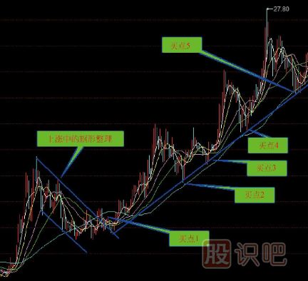1.在股價上升趨勢中,當(dāng)股價下跌而觸及股價上升趨勢線時,便是絕佳的買點(diǎn)(買進(jìn)信號),投資者可酌量買進(jìn)股票。