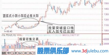 圓弧形態(tài)一般出現(xiàn)在調(diào)整后或者橫盤整理挖坑后走出的圖形,從技術形態(tài)上看有二個特別現(xiàn)象是,一個是在圓弧底位會出現(xiàn)密集交易區(qū),(密集交易就是說持續(xù)幾天的K線長短差不多),二是均量萎縮,但是陽線是有帶量的,陰線非??s量。但在圓弧快形成階段量能會逐步放大,這個階段為初步買入信號出現(xiàn),一旦放量突破前弧口處為黃金介入點,如果你錯過這一點位,那么一般突破后都會有一個回落過程,當然回落不破支撐線可再一次介入信號出現(xiàn)。如果這一次買入信號錯過你必將后悔,因為后面少有機會介入了,不管后市怎么調(diào)整也難回到前面這個價位。一般出現(xiàn)類似圓弧圖形的,在后期都會走一大波行情出來,圓弧越大,主力吸籌越多,后市走向越高。