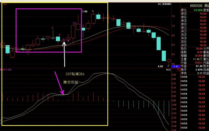 在下跌通道中:8根K線(xiàn)中是由5根(下跌)和3根(上漲)K線(xiàn)組成;10根K線(xiàn)中是由7根(下跌)和3根(上漲)K線(xiàn)組成!當(dāng)MACD形成金叉上漲運(yùn)行,運(yùn)行到0軸上方,紅色柱子不斷增多,DIF回