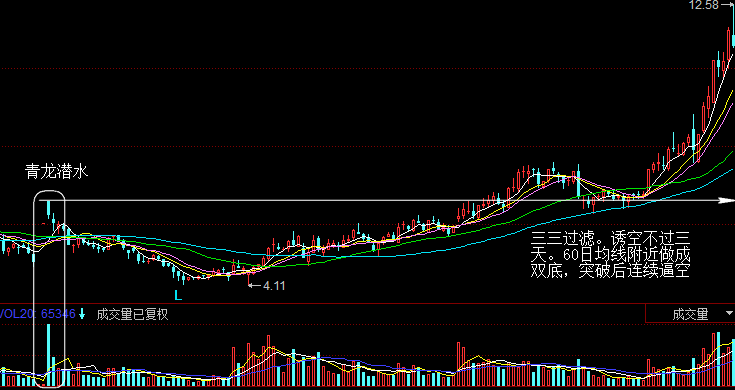 3.一般青龍入水后有30-50個(gè)交易日的調(diào)整,調(diào)整過程中需要配合著地量群,成交量越小越好。 4.介入點(diǎn)有左側(cè)交易和右側(cè)交易兩種方法。左側(cè)交易是等待短均金叉且配合黃金柱出現(xiàn)則逢低介入,而右側(cè)交易是等待長(zhǎng)陽(yáng)突破光頭陰線的“水面”后跟進(jìn)操作,一旦長(zhǎng)陽(yáng)突破水面,打開中級(jí)上漲空間,則龍飛九天。 從它的技術(shù)特征及介入方法可以看出,這是一種易受到右側(cè)交易者青睞的典型的中線交易方法。