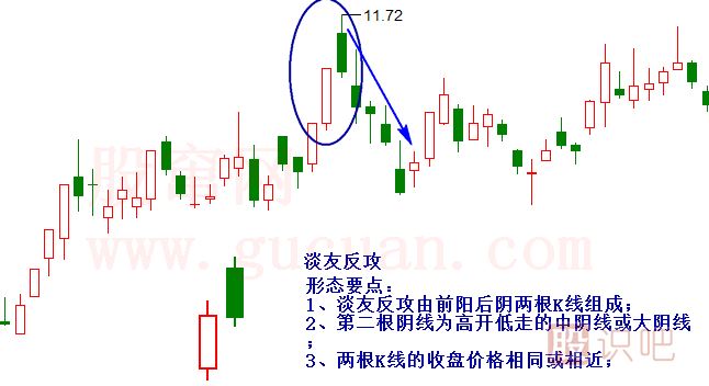 淡友反攻淡友反攻案例講解:豫光金鉛(600531)在2010年的一波上漲行情中,于11月10日收出一根大陽線,但11日收出一個高開低走的大陰線,形成一...