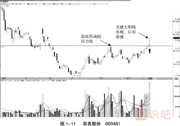 (1)具有突破性質的大陽線是最值得關注的大陽線,在實戰(zhàn)中其地位非常重要。一般來說,大陽線突破意味著趨勢的開始。