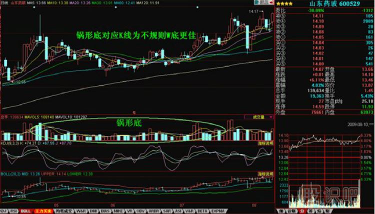 2、鍋形對應的K線形態(tài)為不規(guī)則較淺的w底,量形合一;